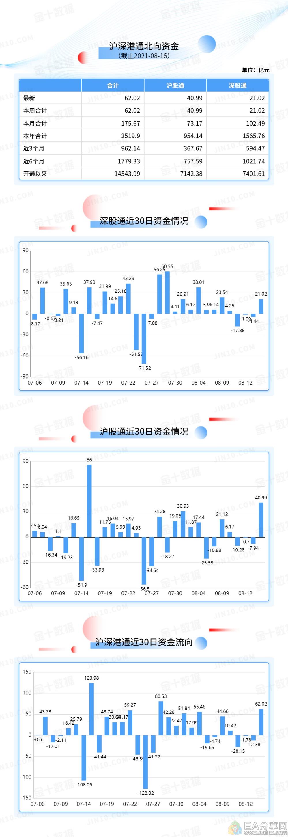 8月16日,北向资金全天大幅买入62.02亿元,为连续3个交易日净卖出。其中沪股通净买入40.99亿元,深股通净买入21.02亿元