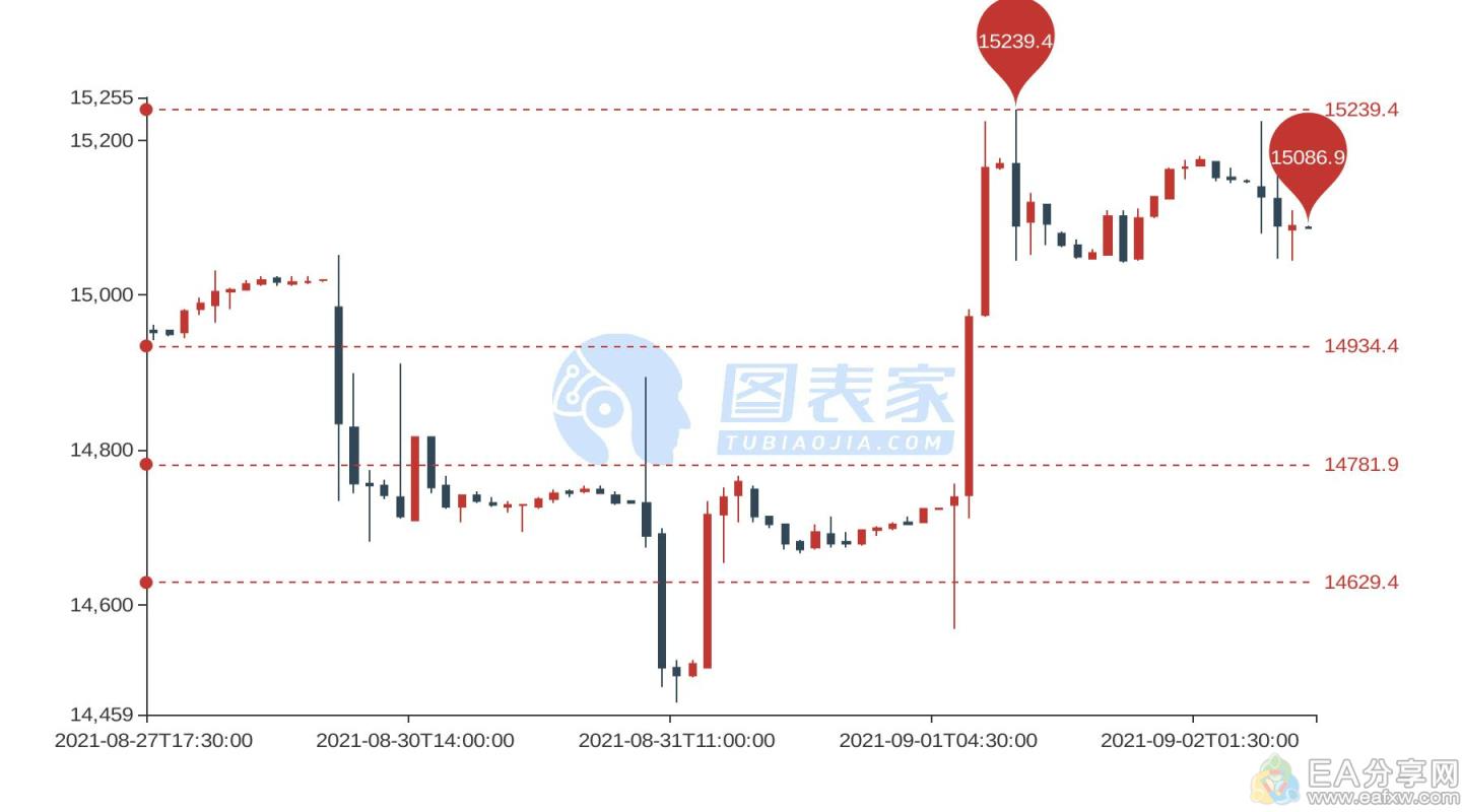 若价格上行且突破高点15239.4,则该看跌信号失效。
