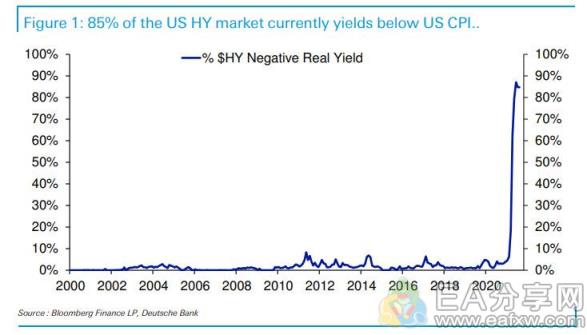 随后,里德给出了下图,数据显示,美国高收益率债券市场中85%债券的实际收益率一直低于通胀率。