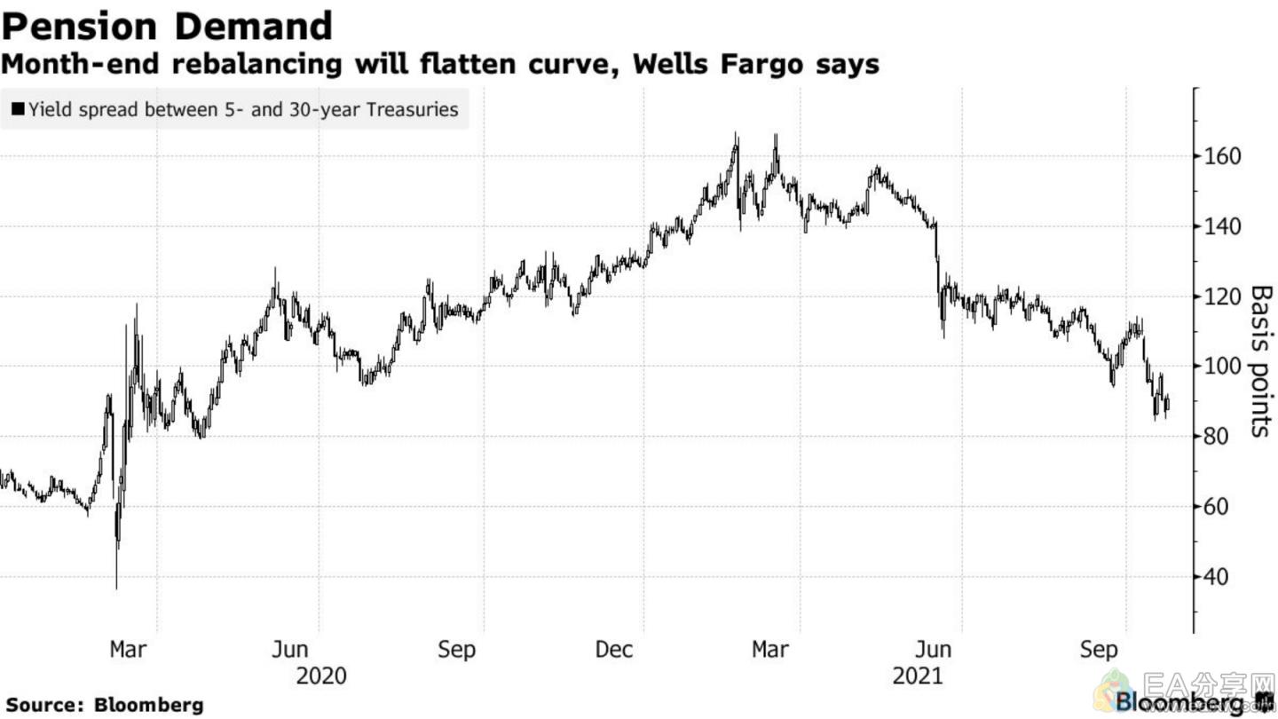 又到了月末调仓之时,分析认为美国的养老基金本月需要将50亿美元资金从股市转移到固定收益产品中进行再平衡,目前日趋平坦的美国国债收益率曲线或将进一步平坦化。