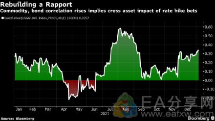10年期美债收益率和彭博大宗商品指数之间的40天相关性有所增强。上一次,两者具有如此密切的相关性是去年7月份,当时德尔塔毒株盛行,对经济增长的忧虑一并压低了收益率和油价。这一次,两者也在同向波动,但是方向却相反。