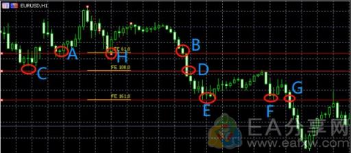 比如在下图整体跌势下,3条扩展线都起到了支撑的作用。61.8扩展线在A和H处都被验证了支撑作用,但在B处被跌破。跌势比较强,连续跌破了100线位。最后在E处,161.8扩展线支撑住,趋势开始反弹,最终在F处再次支撑后,在G处161.8扩展线也被跌破。