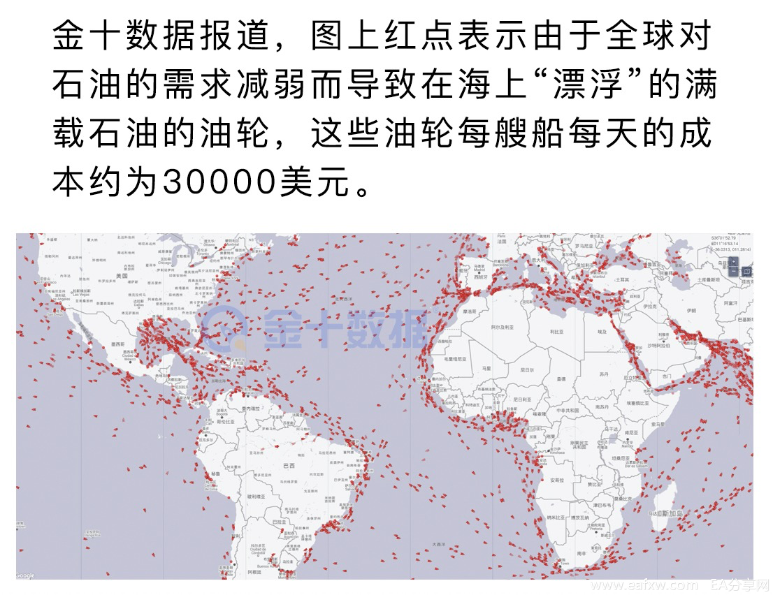 目前,海上储油量已达到创纪录的1.6亿桶,还有近7000万桶成品油也储存在全球各地的油轮上。全球航运巨头Clarksons Platou预计海上石油可能已增至2.5亿桶。如今,海上可以说是到处都飘着装满原油的油轮,如下图所示: