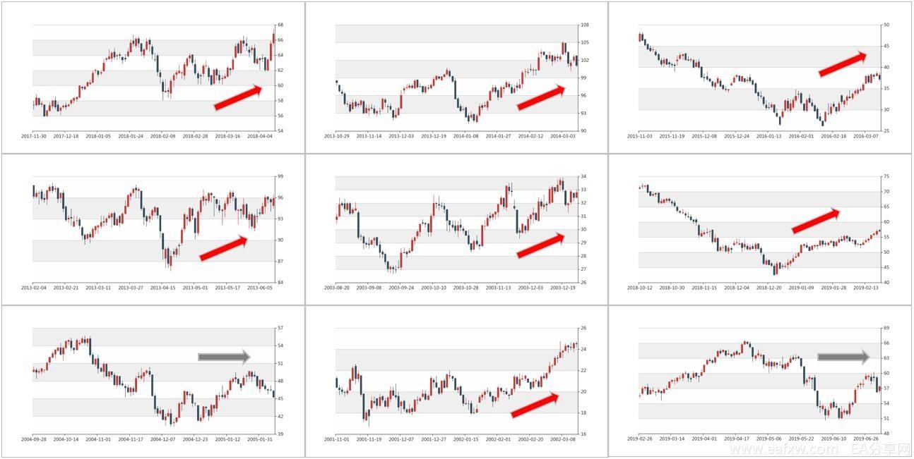 图表家将近期的原油走势为样本,筛选出历史上相似程度达到80%以上的走势,并观察历史走势后30天的行情,发现7次上涨,2次横盘,0次下跌,其中横盘走势大多是震荡走高,历史统计显示原油五月份走高的可能性较大。