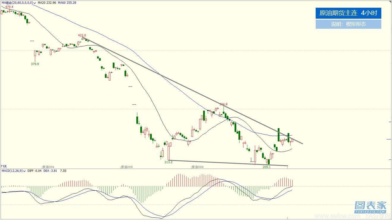 从技术分析的角度来看,日线图级别原油呈现底部的楔形形态,这个形态一般是中继形态,若在底部出现则为反转形态。