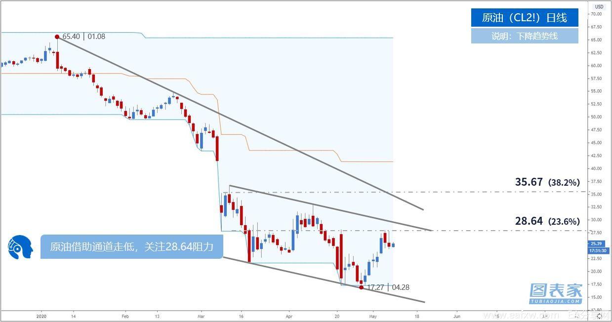 从CL2!(目前为CL2007)的价格走势来看,原油借助下降通道走低,目前是确认下轨后反弹至上轨附近,最近的阻力在斐波那契23.6%回调位28.64,紧接着是35.67.