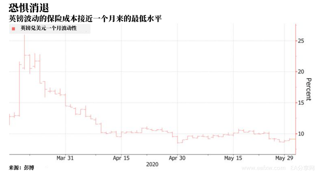 不过,在期权方面,英镑兑美元汇率波动的保险成本并没有飙升。下个月,它将一直徘徊在5月初以来的最低水平附近。