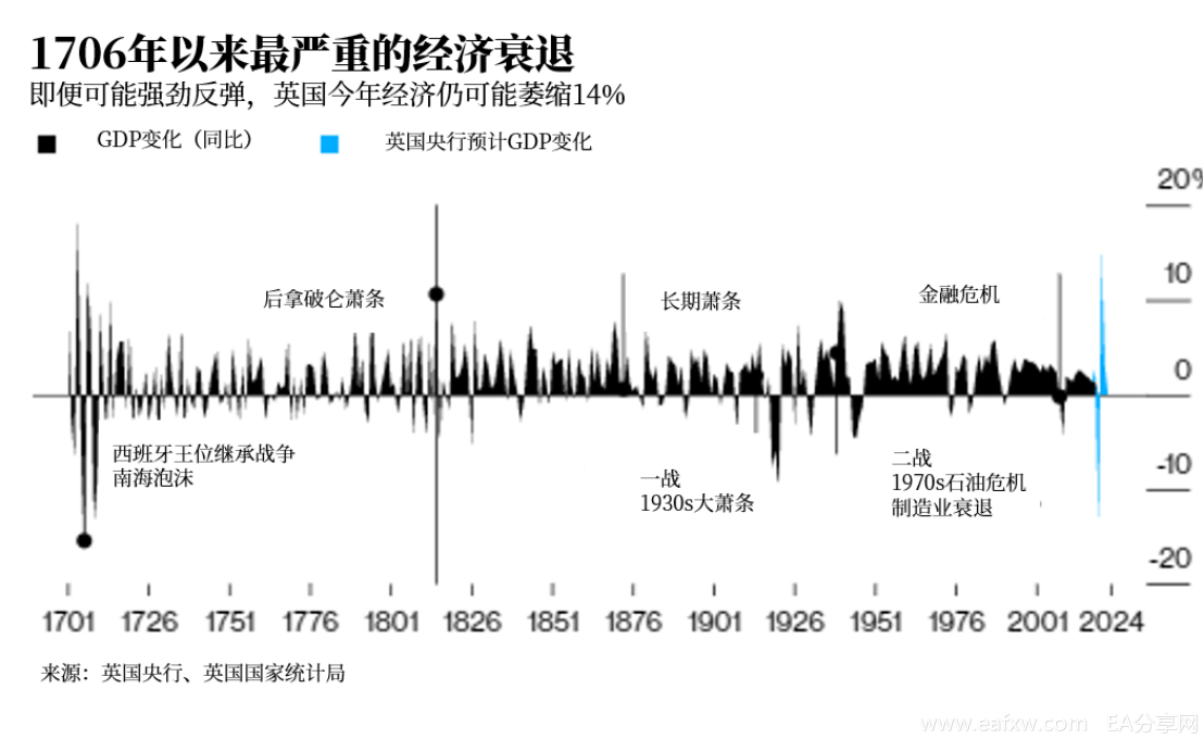英国央行上月预测了英国今年经济可能萎缩14%;接下来艰难的脱欧问题,又可能会打击官员们所预计的复苏态势。