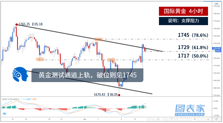 图为黄金4小时走势,价格测试斐波那契61.8%回调位1729水平后反弹,目前正试图再次突破通道上轨阻力,MACD指标显示价格上行压力依然较大,若价格成功破位,则阻力见斐波那契78.6%回调位和前高组成的1745共振水平,接着是前高1765。