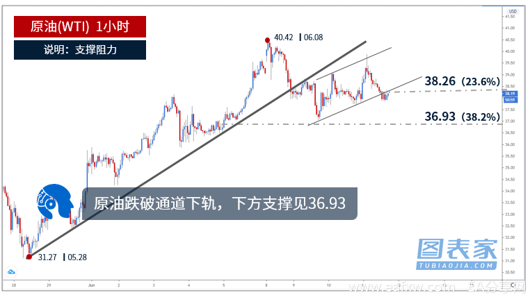 图为原油1小时走势,价格短线回落,跌破上升通道下轨和斐波那契23.6%回调位38.26组成的强支撑,目前价格正在该水平下方徘徊,若价格进一步走低,则可能测试斐波那契38.2%回调位36.93。