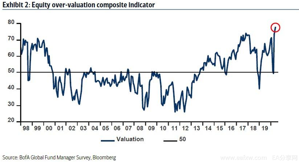 从持仓变化来看,6月份市场的风险偏好明显飙升——对冲基金开始减少现金持有量,大举投资股票。但矛盾的是,美国银行最新的基金经理调查又显示,大多数基金经理依旧认为股市估值过高。