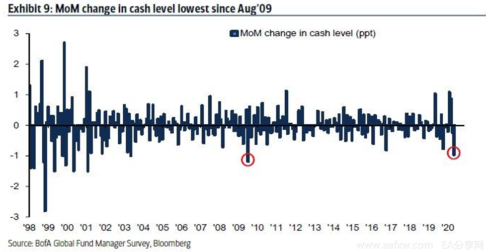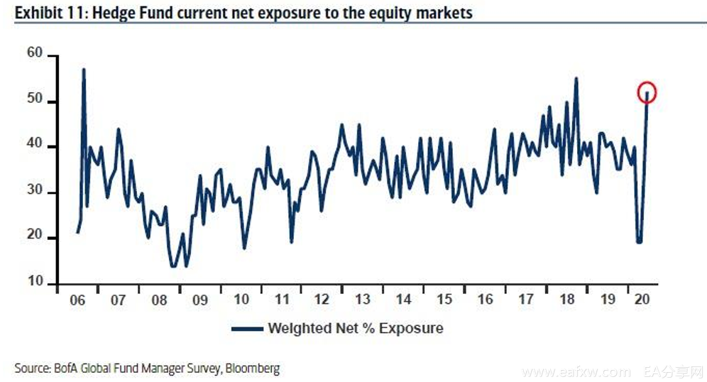 该调查显示,基金经理将他们的现金头寸从5.7%削减至4.7%以追赶股市,这是自2009年8月以来的最大跌幅此外,由于标普500指数较今年低点上涨超过30%,为追赶散户投资者,对冲基金将股票敞口比例从34%提升至52%,为2018年9月以来最高水平。