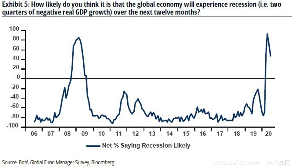 哈特尼特表示,随着封锁解除,人们对GDP和每股收益的预期大幅提升,市场情绪逆转,关于经济将长期衰退的预期也从4月93%的可能性下跌至6月的46%。从持仓来看,投资者加大了对全球经济增长的赌注,但在认知上,他们又预计全球制造业在10月之前都不会出现扩张迹象。