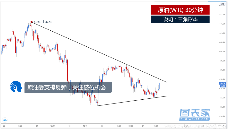 图为原油30分钟走势,价格受支撑反弹,关注破位交易机会。