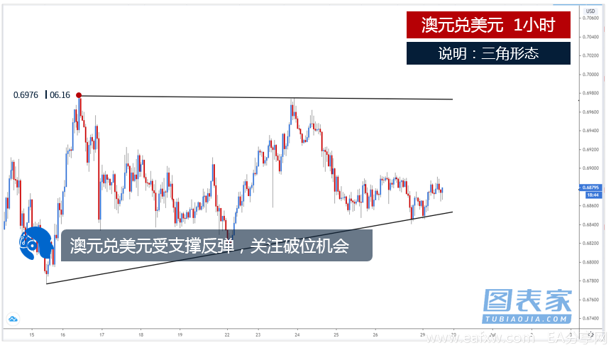 图为澳元兑美元1小时走势,价格受支撑反弹,关注破位交易机会。