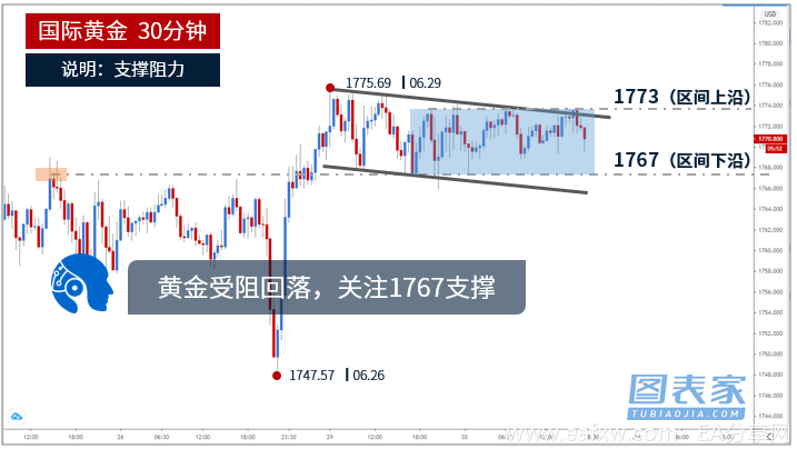 图为黄金30分钟走势,价格沿下降通道小幅回调,在通道内部形成1767-1773的横盘区间。目前价格受阻于区间上沿和通道上轨组成的共振阻力回落,下方支撑见1767水平,该水平在近期数次提供支撑阻力。破位则见通道下轨支撑。