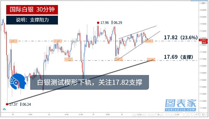 图为白银30分钟走势,价格短线走低,正在测试楔形下轨、斐波那契23.6%回调位17.82以及前高组成的共振支撑,若该支撑破位则见前低17.69水平,该水平也在上升趋势线附近。