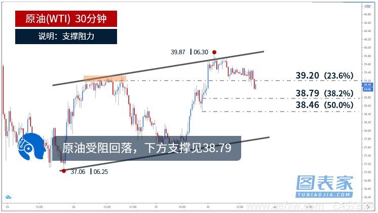 图为原油30分钟走势,价格受阻于通道上轨回落,已经跌破斐波那契23.6%回调位39.20和前高组成的共振支撑,下方支撑见斐波那契38.2%回调位38.79和斐波那契50%回调位38.46。