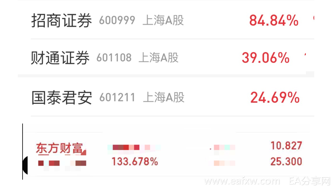 在4月份直播中,Rinly就告诉大家他的股票市场持仓大部分为证券,大家如今也看到,证券板块最近平均涨幅在40%以上,也就是说,当时随便买券商股,现在都能赚得盆满钵满,来看看Rinly的券商股收益。