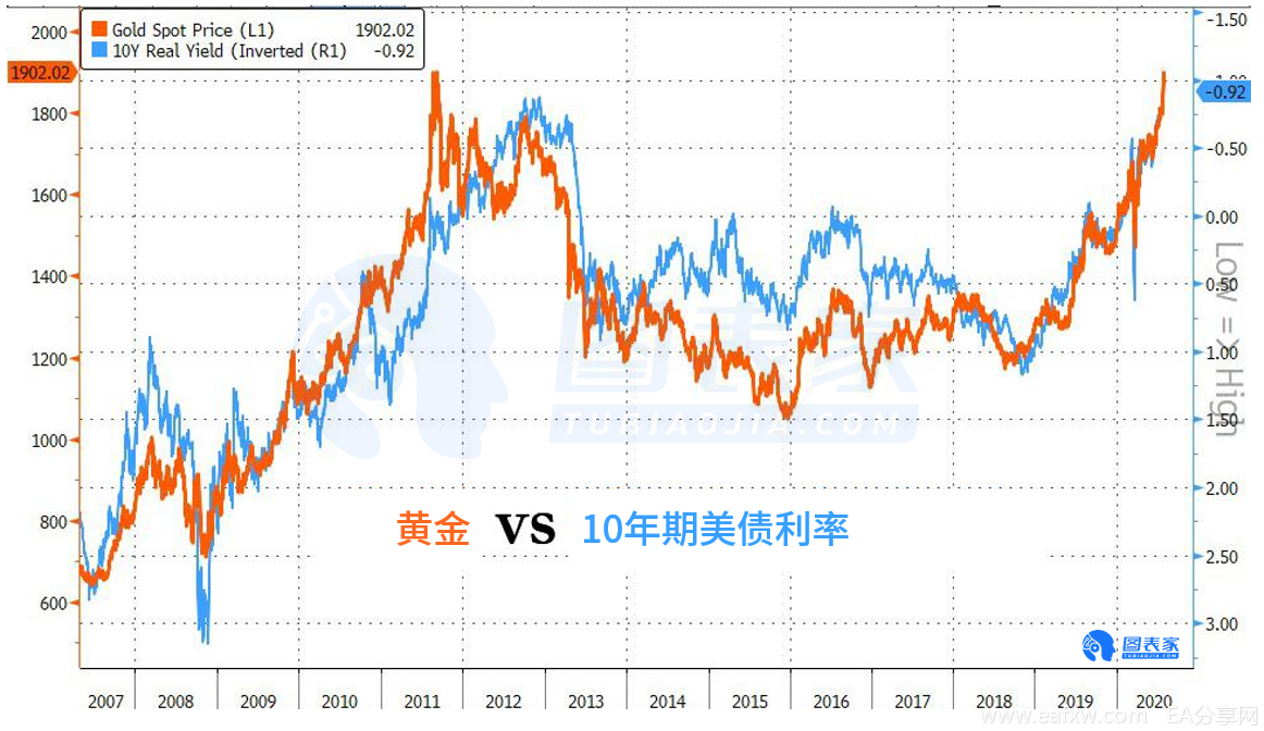 得益于过去一个月美元的大幅贬值,以及10年期美债实际收益率大跌至负值且刷新历史低位。