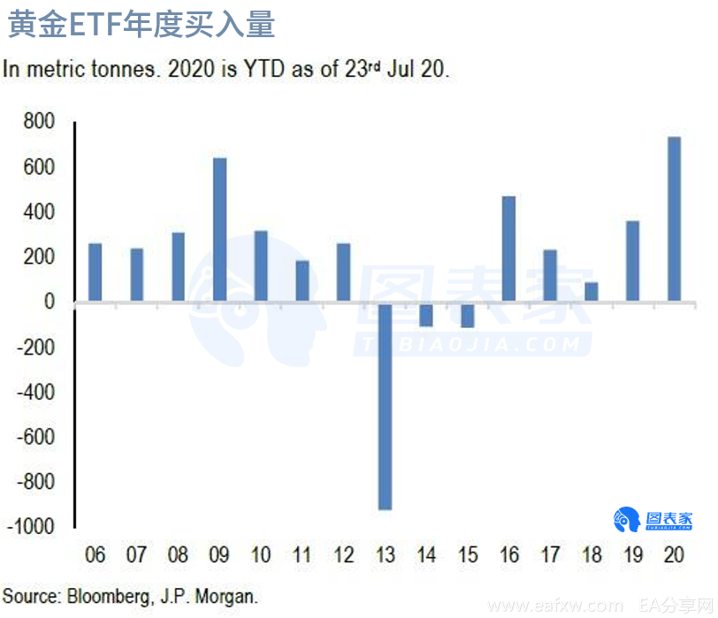 摩根大通的分析师Nikolas Panigirtzoglou表示,散户投资者似乎是近期涨势背后的主要因素,实际上散户购买黄金使用的重要工具之一为黄金ETF,在最近几周该ETF持有量急剧上升,是今年迄今已经刷新年度最高纪录。下图显示了实物黄金ETF的年度流入量(以公吨计)。