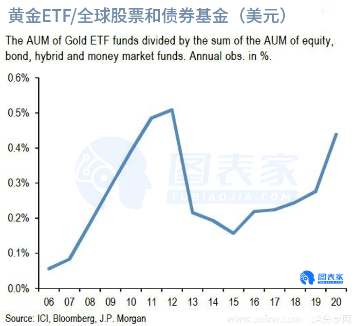 这一比例可以被视为散户投资者黄金配置比例的指标,目前仅比2012年0.5%的峰值低0.03%。2012年的黄金配置高位是否会在当前时刻被打破,仍有待观察。目前,上面的图表暗示金价还有继续上涨的空间。