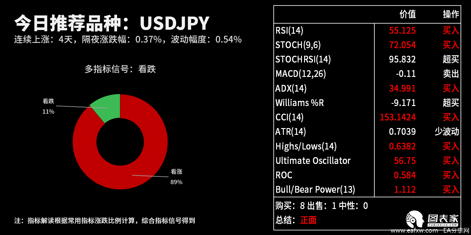 美元日元(上涨:4天,隔夜涨跌幅:0.37%,波动幅度:0.54%)。