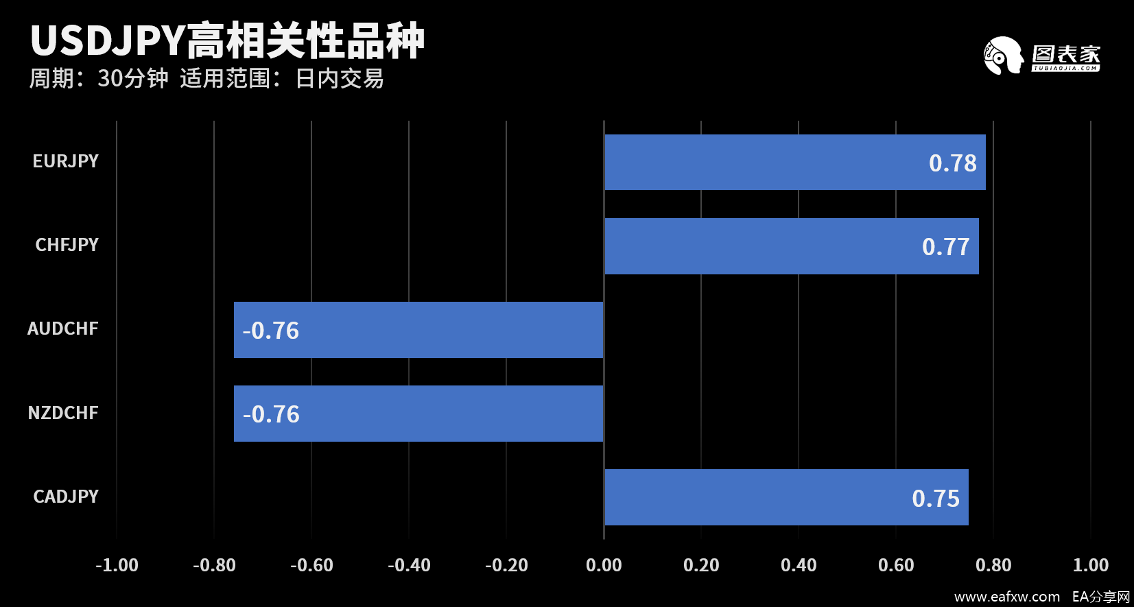 根据外汇相关性实时追踪,USDJPY在30分钟周期下与部分货币的相关性排行如下图: