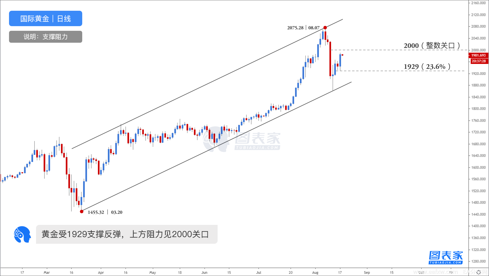图为黄金日线走势,价格受通道下轨支撑后持续走高,昨天价格测试斐波那契23.6%回调位1929水平后守住该支撑并反弹上行,上方阻力见2000关口,接着是前高2075。