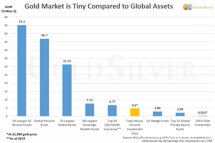 通过对比一些最常见的机构投资者的资产管理规模、已知地上投资级别黄金总量(盎司)、以及2019年的黄金投资需求可以发现,与全球资产相比,黄金市场的规模相形见绌。