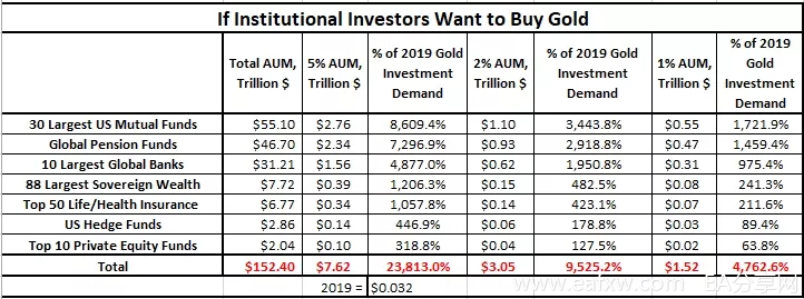 可以看到,红字一栏显示,即使这些机构只将最低的1%的资金投入实物黄金市场,他们能买到的黄金数量也将远远超出2019年的投资需求。