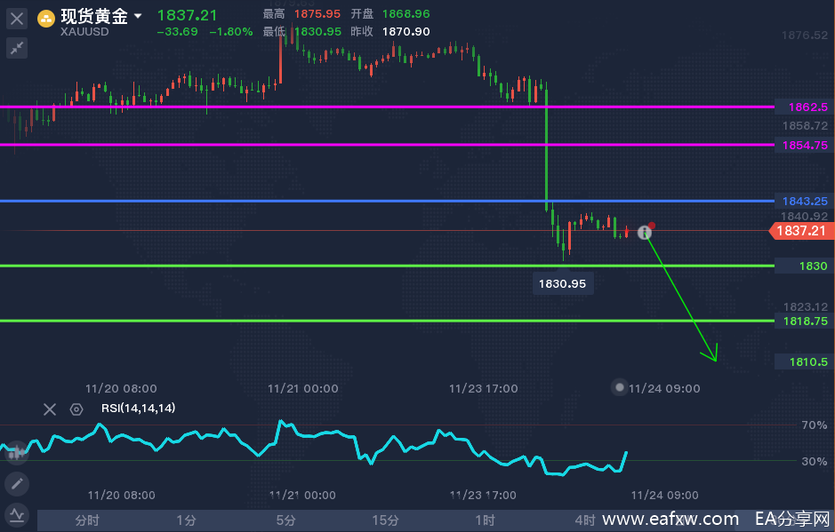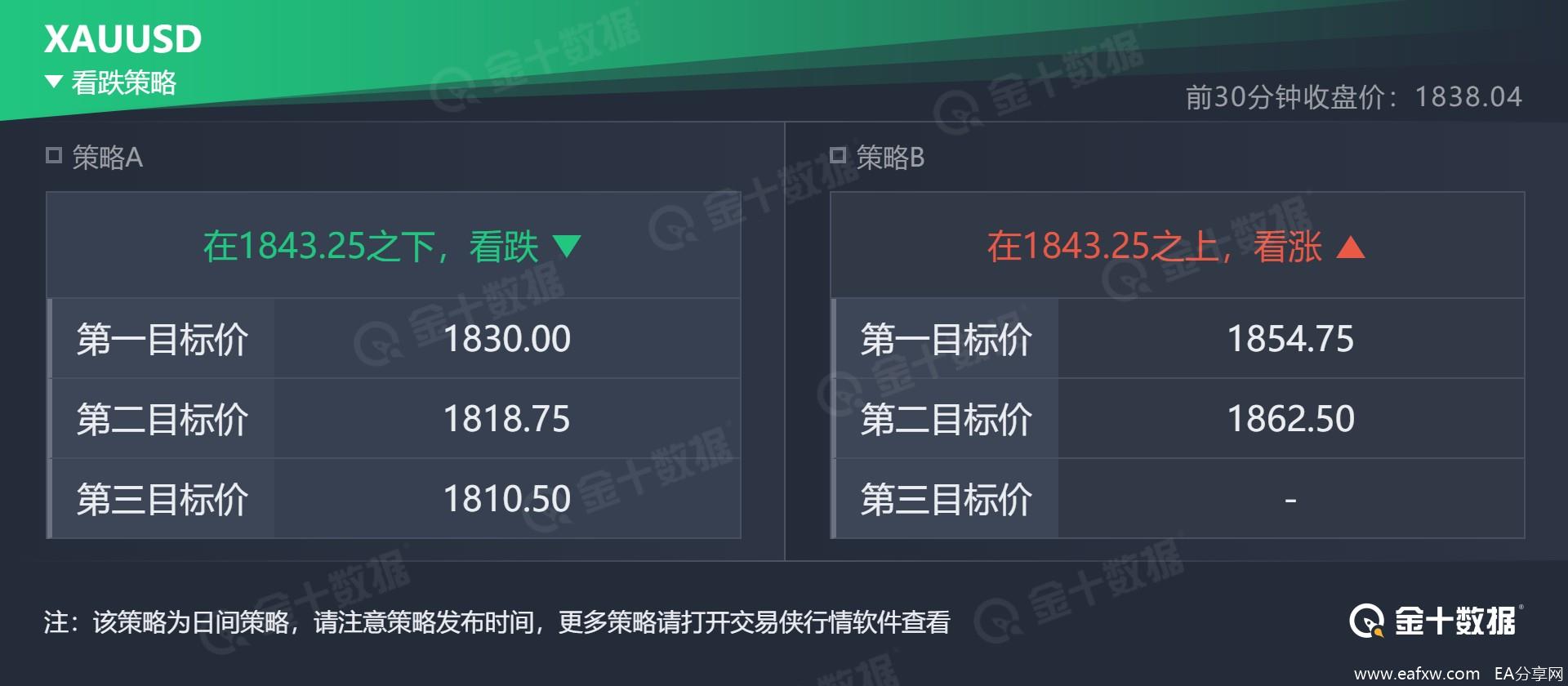 现货黄金只要无法突破1843.25阻力位,价格波动就存在看跌的趋势。亚盘转折点为1843.25,金价当前运行在转折点1843.25下方,关注1830、1818.75支撑位。若之后回到1843.25之上,则留意上方1854.75、1862.50阻力情况。