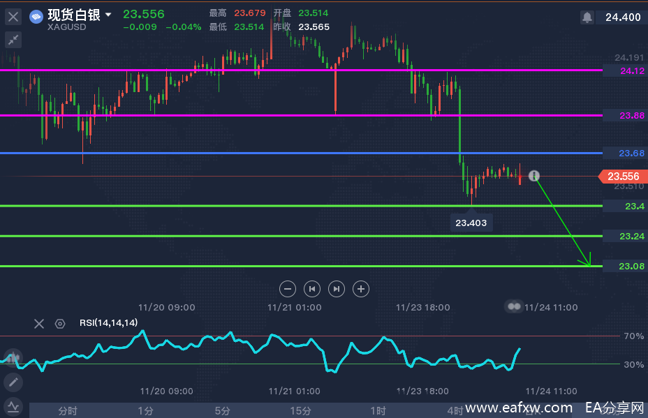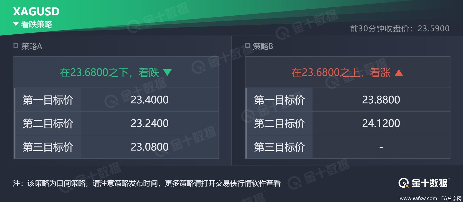 现货白银上升的空间可能被23.68阻力位所限制。亚盘关键转折点为23.68,当前银价运行在该点下方,关注23.40、23.24支撑情况。若运行至23.68上方,则需留意上方23.88、24.12的阻力情况。