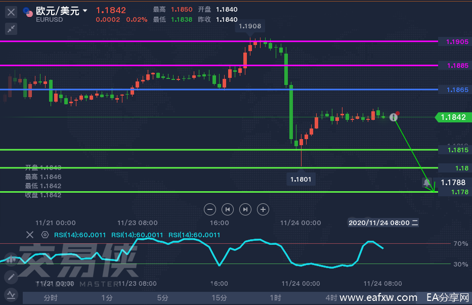 欧元/美元亚盘关键转折点为1.1865 ,在转折点1.1865 下方,留意1.1815、1.1800支撑位。若运行至1.1865 上方,则需留意上方1.1885、1.1905阻力情况。