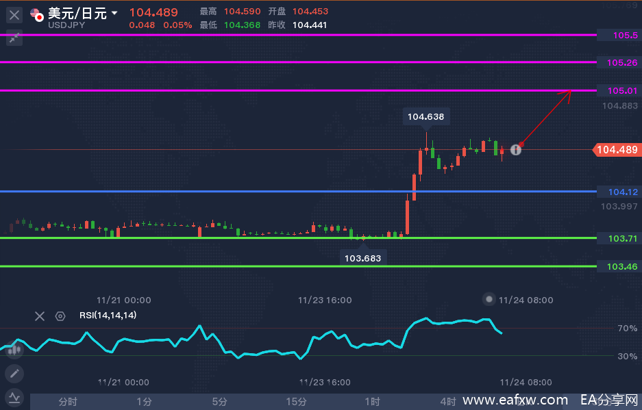 美元/日元价位处在20天及50天的移动平均线上方(104.16和103.93)。亚盘转折点为104.12,目前运行在 104.12上方,关注105.26、105.50阻力情况;若在104.12之下,则留意下方目标价位103.71,然后为103.46。