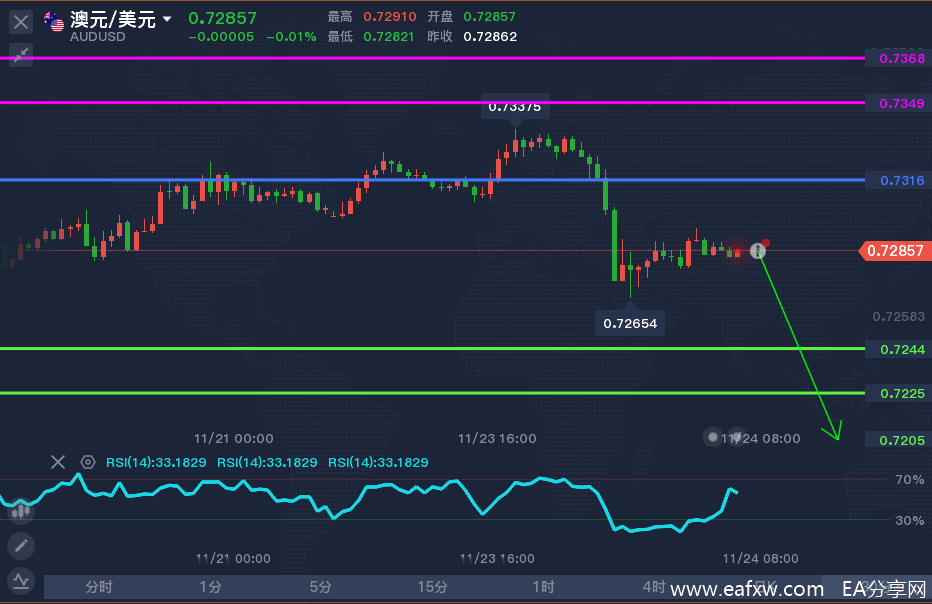 AOI策略所提及的多空转折点以及支撑阻力仅适用于日内超短线交易,并将根据日内波幅ATR变化而动态调整。文中AOI指标的日内交易策略更新频率较高,已经支持在交易侠的指标里面调用,如果想更及时获取点位变动情况,点这里可以下载交易侠体验,大家还可以添加大刘微信及时获取其他品种信息(微信在文末)。