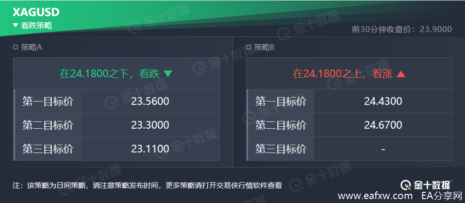 现货白银转折点在24.18,目前在该点下方承压,留意是否会跌破23.56,若跌破恐看向23.30。若之后回升至24.18之上,则有望上看24.43、24.67目标位。