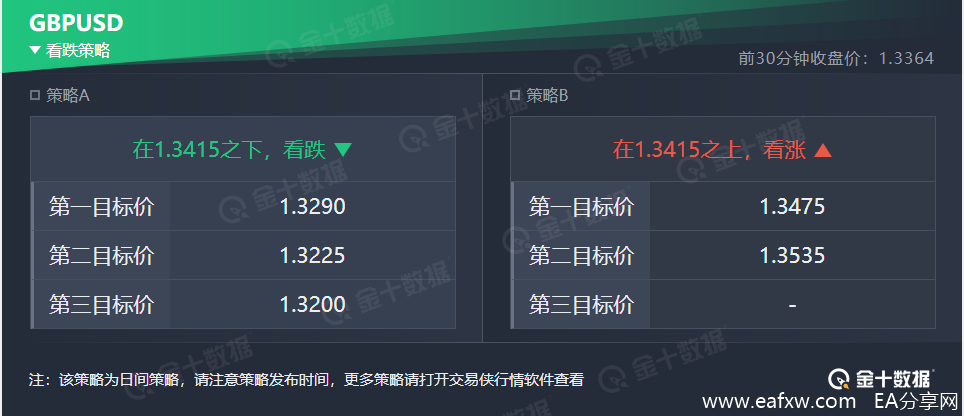 镑美多空转折点在1.3415,在此之下看跌,留意下方1.3290和1.3225的支撑;若回升至转折点之上,上方还有1.3475和1.3535两个阻力要突破。