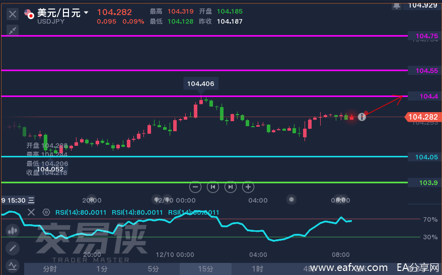美日多空转折点为104.05,目前该货币对在转折点上方运行,留意能否突破上方104.40和104.55两个阻力;若跌破104.05,则有跌向103.90和103.75的风险。
