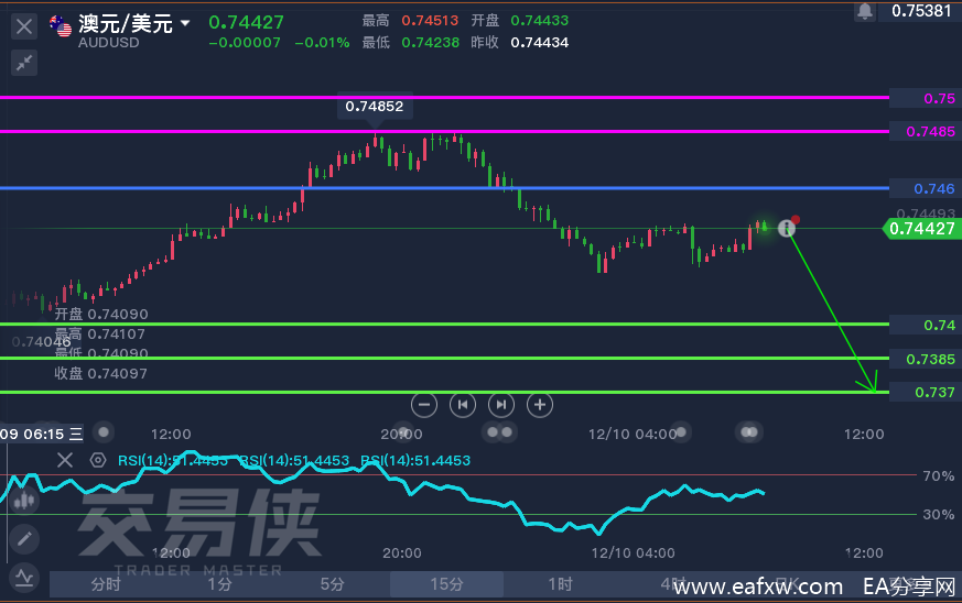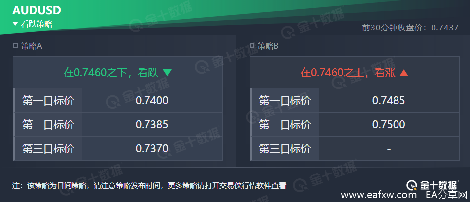 周三澳美一度大涨1%,来到周四,多空转折点在0.7460,在该水平之下有跌破0.74关口的风险,若无法守住0.74,则留意0.7285支撑情况;若之后突破0.7460,则关注上方0.7485、0.7500两个阻力位。