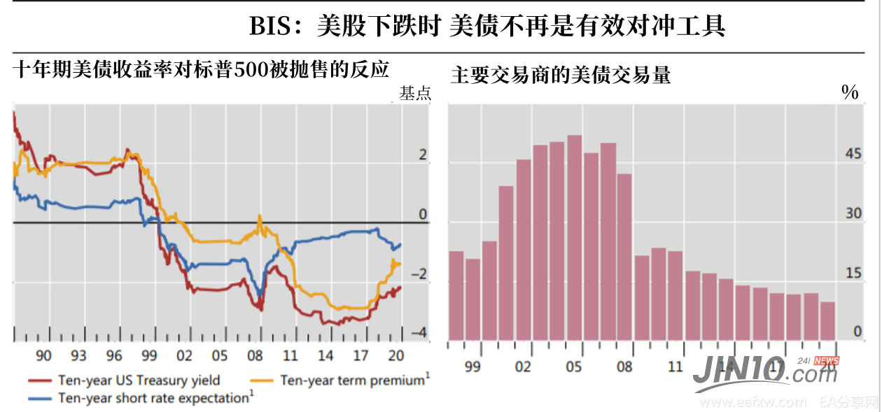 无独有偶,近日贝莱德和国际清算银行(BIS)都发表了对美债的负面看法,后者认为美股下跌时美债不再是有效对冲工具