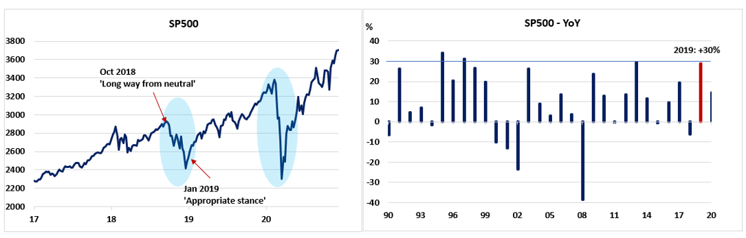 当时标普500指数从峰值下跌了20%,这迫使美联储主席鲍威尔在2019年1月份开始改变货币政策立场,从之前的“鹰派”变成“略为鸽派”。